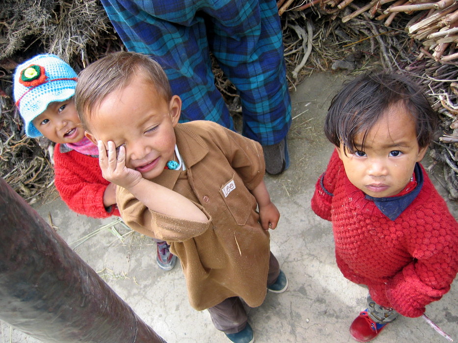 Children and firewood stacked on a rooftop
