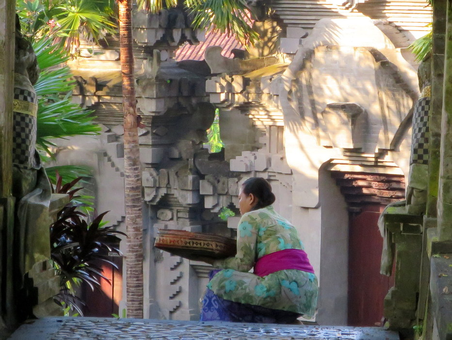 Woman placing offerings to the Gods on a stairway